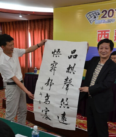 發(fā)布會最后曹大元九段代表兩隊(duì)棋手像王斌贈送國手簽名的棋盤,王斌則用三幅字回贈兩隊(duì)。