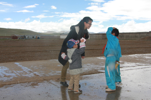 2007年8月援教期滿后,白覺措回到拉薩,在當(dāng)雄縣納木湖鄉(xiāng)中心小學(xué)任教。四千八百米的納木湖鄉(xiāng)中心小學(xué)是拉薩市海拔最高的學(xué)校。每到冬天,這里都會迎來大風(fēng)雪。而在大雪封山時,蔬菜是運不進(jìn)來的。所以,白覺措和其他老師還要利用休息的時間帶領(lǐng)學(xué)生們在學(xué)校的高寒溫棚內(nèi)自己種菜,以備不時之需。白覺措淡淡得說道:“這里的夏天是很美,冬天卻讓人受不了。而且夏天并不是天天都是風(fēng)和日麗,時不時還會來場冰暴。”正說話間,豆大的冰雹就下起來,“噼哩叭啦”打在窗戶上。白覺措急忙起身向外走去,因為正值午飯時間,學(xué)生們正朝食堂走向。天冷地滑,怕學(xué)生摔倒白覺措拉著自己兩歲半的兒子,站在空地上,對著遠(yuǎn)處跑來的學(xué)生不停地喊道:“慢點,慢點,小心摔倒!……”。