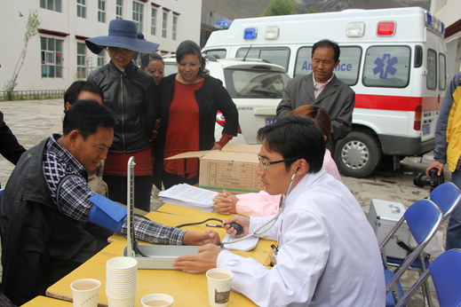 通過為尼木縣鄉(xiāng)村小學(xué)老師們的體檢,董發(fā)善醫(yī)生說:“大部分老師都患有血管神經(jīng)性頭疼和不同程度的胃病和膽囊疾病。這是由于在鄉(xiāng)村學(xué)校中,老師們工作繁忙,經(jīng)常忘記吃飯或者到了吃飯的時候就湊合吃幾片風(fēng)干肉,喝幾杯酥油茶。這是造成鄉(xiāng)村老師腸胃和膽囊疾病的原因。此外,由于老師們經(jīng)常站著講課,腰椎疾病的患病率比其他行業(yè)的要高。”在體檢的同時,醫(yī)護人員還向老師們發(fā)放了常見疾病預(yù)防知識的宣傳材料。
