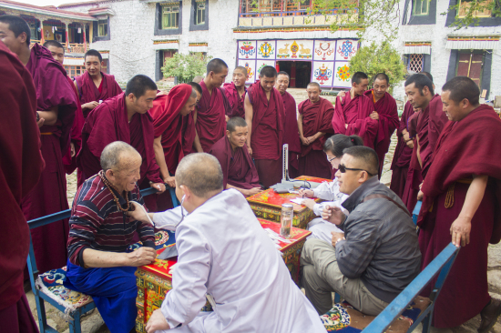 義診現(xiàn)場,醫(yī)療隊(duì)熱情接待每一位前來就診或咨詢的僧侶,為其看病、發(fā)放藥品及講解日常健康知識和自我保健的方法,僧侶們也由一開始的只是駐足觀望轉(zhuǎn)為積極上前就診,并主動向醫(yī)療隊(duì)闡述自己的病狀,同時針灸科李泉濤醫(yī)生更是不間斷地為多位經(jīng)常久坐寺中的僧侶推拿與按摩頸、肩、腰、腿等各個部位。中午時分,醫(yī)療隊(duì)還受邀與僧侶們一起吃齋飯。