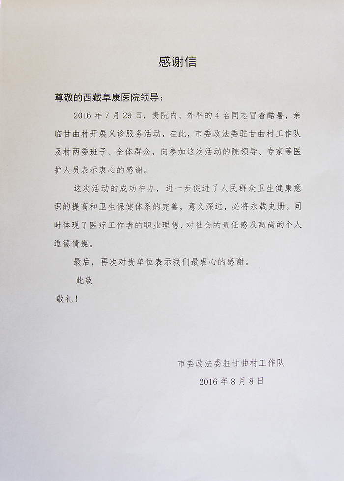 2016年7月,林周縣朱加村村委會、甘曲村村委會受當?shù)卮迕袼?,與林周縣人民醫(yī)院和西藏阜康醫(yī)院相關(guān)負責人取得聯(lián)系,希望能夠派遣醫(yī)療義診隊為當?shù)卮迕衩赓M義診。7月29日經(jīng)相關(guān)領(lǐng)導協(xié)調(diào),西藏阜康醫(yī)院派出了由外科專家李玉仲、內(nèi)科專家劉占懷及幾名護理人員組成的義診小分隊先后前往朱加村、甘曲村為當?shù)卮迕衩赓M義診。