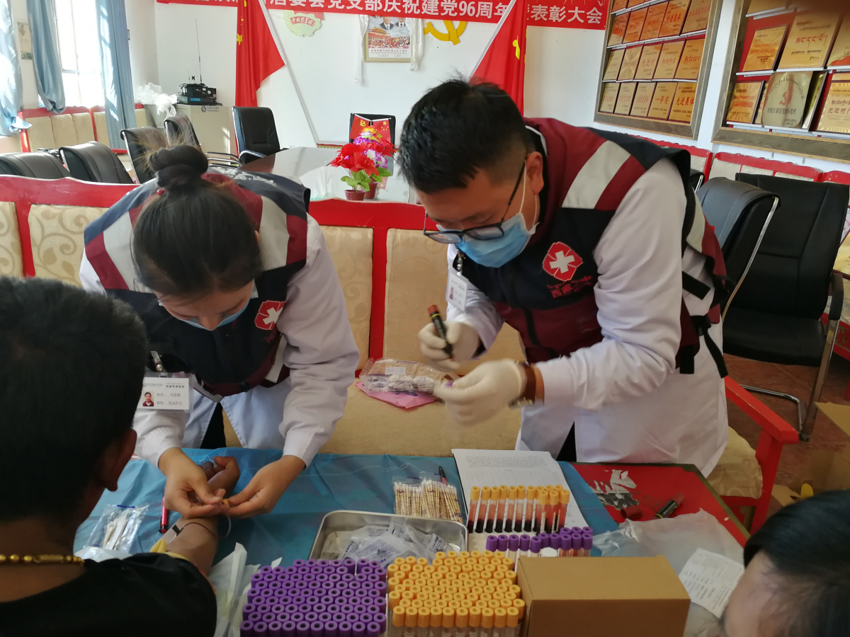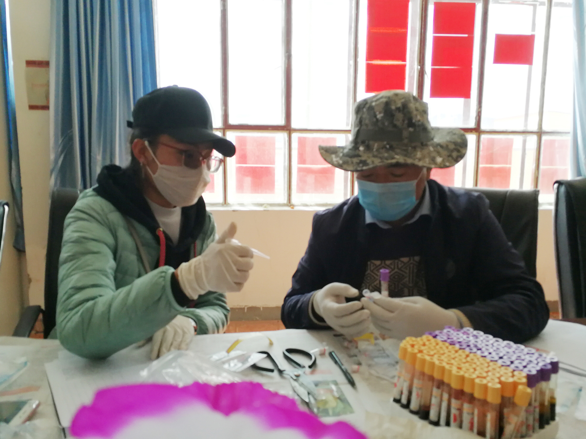 鐘義華、劉亞美、丁雪琴分到另一組,負(fù)責(zé)采血和血樣信息錄入工作。鐘義華是檢驗(yàn)士也是隊(duì)長,更是我們醫(yī)療隊(duì)唯一的男孩子,重活、粗活全包,還要負(fù)責(zé)隊(duì)員的工作安排,以及與政府領(lǐng)導(dǎo)、工作人員的溝通協(xié)調(diào),除此之外,他還要負(fù)責(zé)血樣采集、包蟲病防治的宣傳。