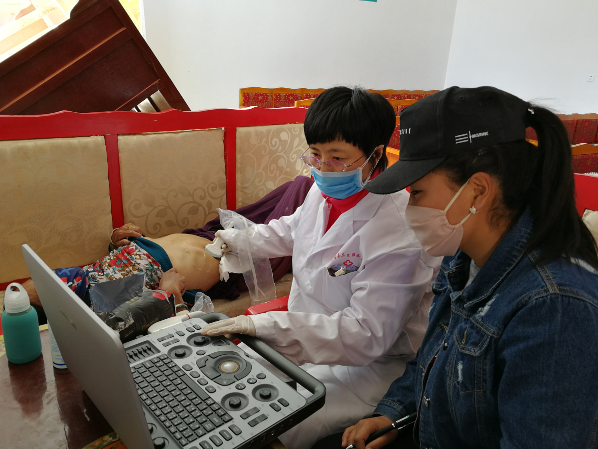 劉冬梅醫(yī)生和格桑拉吉被分到一組,負(fù)責(zé)B超檢查,在這里大部分群眾不會(huì)漢語,格桑拉吉除了要負(fù)責(zé)B超檢查、做錄入還要負(fù)責(zé)翻譯工作。遵照黨委書記王斌同志的指示,劉冬梅醫(yī)生除了要高質(zhì)量地完成政府安排的肝臟B超檢查外,還要額外為群眾檢查膽、腎臟,這無疑極大地增加了她的工作量。在工作中的她兢兢業(yè)業(yè),一絲不茍,那專注的神情,是我見過的最美的樣子。