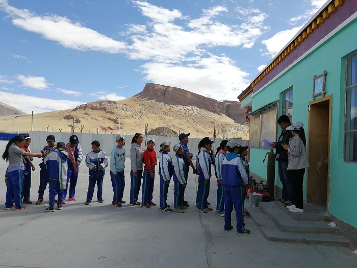 我跟隨劉冬梅醫(yī)生組前往革吉縣初級(jí)中學(xué)進(jìn)行篩查工作,學(xué)生們?cè)诎嘀魅蔚膸ьI(lǐng)下,排著整齊的隊(duì)伍,填寫(xiě)資料、做B超、抽血留樣,秩序井然。