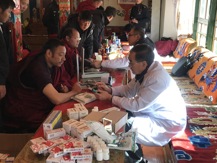 【概要:12月10日上午,在西藏阜康醫(yī)院名譽(yù)院長(zhǎng)、慢病管理中心主任張德才的帶領(lǐng)下,阜康義診分隊(duì)一行6人來(lái)到楚布寺,為附近的僧侶和群眾免費(fèi)測(cè)血壓、測(cè)血糖、并發(fā)放常見疾病的藥物?!?/span>