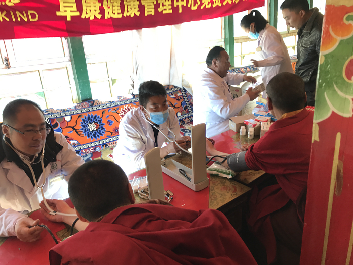 隨后,義診活動(dòng)井然有序地開始了,張?jiān)洪L(zhǎng)和田豐輝醫(yī)生負(fù)責(zé)測(cè)血壓,護(hù)士唐宗青測(cè)血糖,瓊瑪負(fù)責(zé)發(fā)放藥品,占堆(我院體檢中心醫(yī)務(wù)人員)對(duì)每一位血壓、血糖高的僧人、群眾進(jìn)行登記,有利于以后對(duì)他們的健康進(jìn)行隨訪跟蹤,了解他們有無(wú)不適以及血壓、血糖情況,督促他們的按時(shí)服藥、并指導(dǎo)他們健康的生活方式。在義診體檢過(guò)程中,一名76歲的老人,血壓200/120mmHg,經(jīng)過(guò)詢問,老人身體并沒有不適,在詳細(xì)的給老人講解了高血壓對(duì)身體健康的影響,以及高血壓帶來(lái)的危害后,并給予老人免費(fèi)發(fā)了治療高血壓的藥物,囑咐他這幾天要每天規(guī)律服用降壓藥物、監(jiān)測(cè)血壓,直至血壓在正常范圍后可以改為三到五天測(cè)一次血壓,但降血壓藥物不能停止,老人欣然接受意見,并握手致謝。