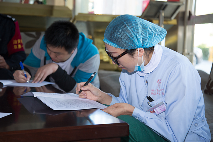 參加獻(xiàn)血的醫(yī)務(wù)人員填寫表格