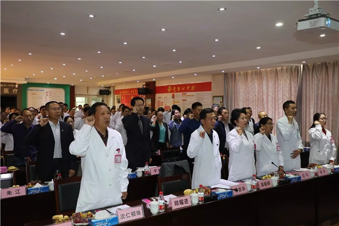 慶?;顒?dòng)在下午15點(diǎn)準(zhǔn)時(shí)進(jìn)行。西藏阜康醫(yī)院醫(yī)務(wù)科主任田鵬帶領(lǐng)與會(huì)醫(yī)師代表宣讀“希波克拉底誓言”,西藏阜康醫(yī)院婦產(chǎn)兒童院區(qū)(院區(qū)三)劉連福院長(zhǎng)致辭。