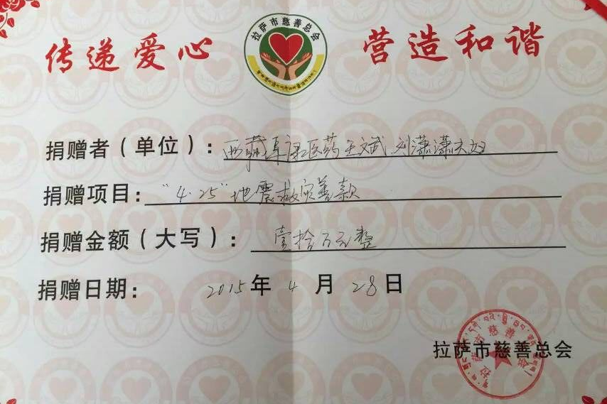 在西藏,哪家有災(zāi)哪家有難,在王斌董事長(zhǎng)知情的情況下,都會(huì)伸出援助之手,這次尼泊爾地震,除了醫(yī)院募捐的現(xiàn)金205682元外,王總私人還拿出了十萬元捐贈(zèng)給災(zāi)區(qū),希望自己的綿薄之力能助災(zāi)區(qū)人民早日走出陰霾。