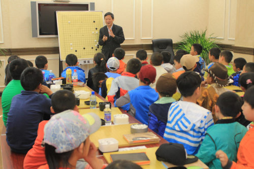 頒完獎項,本次拉薩市2015年“阜康杯”少兒圍棋錦標賽也落下了帷幕。最后,我們有幸請到了國手九段的曹老為我們拉薩棋院的小棋手們講課,課上,一位位小棋手們端正坐好,聚精會神地聆聽著曹老講 課,生怕錯過什么內容。而曹老親切祥和的細微講解,加之其不時跟小朋友們提問、互動,也讓得這節(jié)特殊寶貴的課堂變得其樂融融!感謝曹老于百忙之中抽出時間為我們的小棋手講課,相信我們的小棋手們在這樣一節(jié)課堂中,必然受益良多。