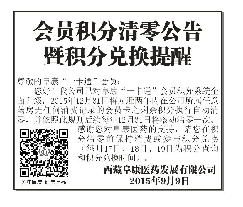 您好!我公司已對(duì)阜康“一卡通”會(huì)員積分系統(tǒng)全面升級(jí),2015年12月31日將對(duì)近兩年內(nèi)在公司所屬任意藥房無任何消費(fèi)記錄的會(huì)員卡之剩余積分執(zhí)行自動(dòng)清零,并依照此規(guī)則后續(xù)每年12月31日將滾動(dòng)清零一次。感謝您對(duì)阜康醫(yī)藥的支持,請(qǐng)您在積分清零前保持消費(fèi)或參與積分兌換(每月17日、18日、19日為積分查詢和積分兌換時(shí)間)。