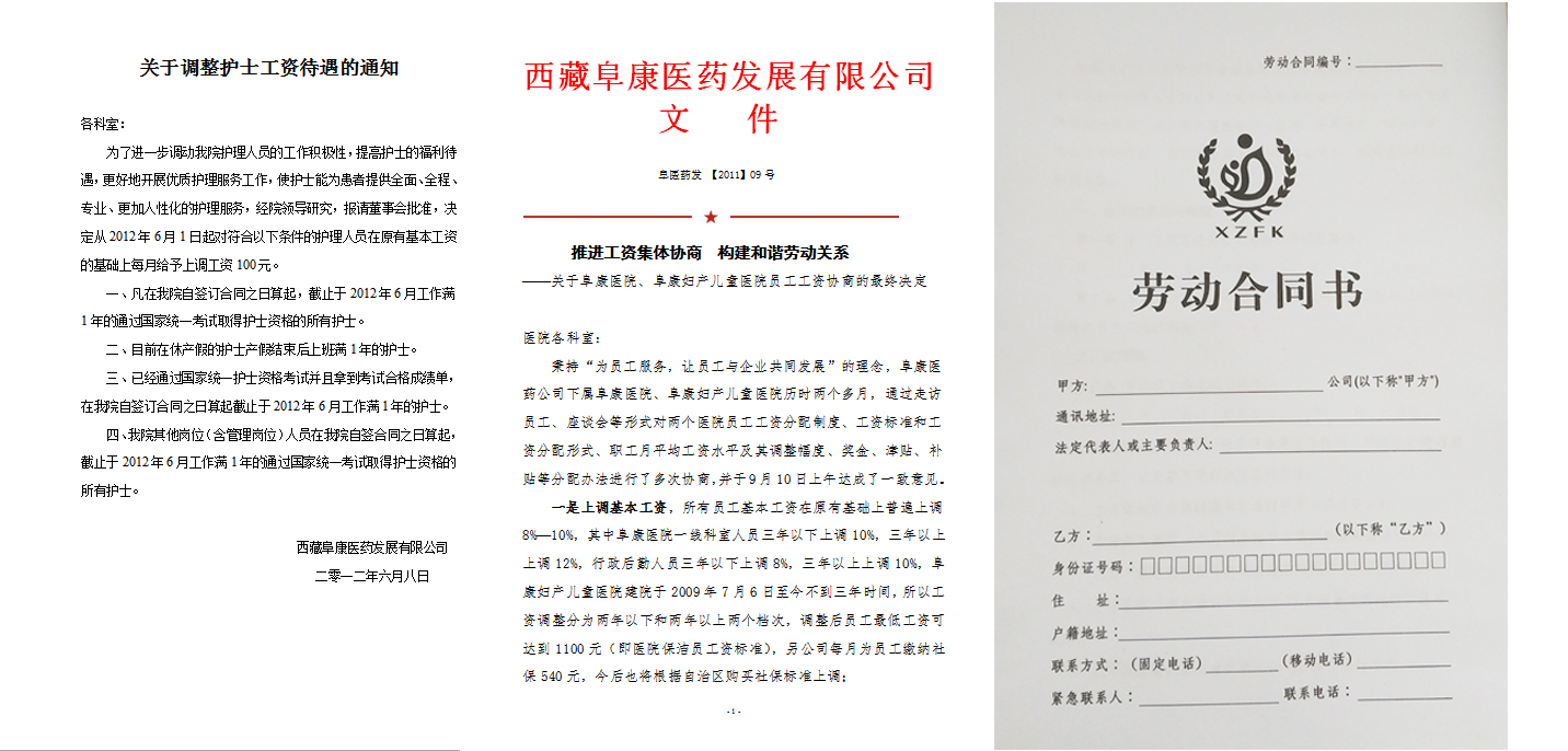 近年來,西藏阜康醫(yī)療股份有限公司高度重視工資集體協(xié)商工作,始終堅持以人為本,維護職工合法權益,認真貫徹《集體合同規(guī)定》。實行院務公開,發(fā)揮職代會作用,認真聽取員工在工資集體協(xié)商方面的意見和建議,根據需要召開職代會聯(lián)席會議,建立穩(wěn)定的分配機制和增資機制,保障了員工對公司工資分配的知情權、協(xié)商權和監(jiān)督權。認真履行《勞動合同》,設立了員工養(yǎng)老、醫(yī)療、工傷、生育、失業(yè)等保險,并足額上繳到位。