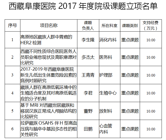 這是我院首次組織申報并批準立項的院級課題。課題主持人均為我院醫(yī)務人員。本年度立項資助的6個課題均為院級重點課題,每項課題將提供10萬元的研究經費。課題自2017年10月1日正式實施,期限為兩年。