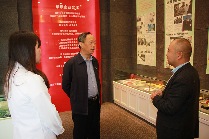 在阜康醫(yī)院五樓院史館,劉連福向劉家杰一行介紹了阜康醫(yī)療不平凡的發(fā)展歷程以及阜康人在黨的建設(shè)、抗震救災(zāi)、公益事業(yè)、企業(yè)文化等方面的成就,劉家杰一行對阜康醫(yī)療各方面的工作表示充分認(rèn)可并對“阜康”中所含的物阜民康——“物產(chǎn)豐富,民族安康”之意表現(xiàn)出極大的興趣,希望通過阜康人在醫(yī)藥領(lǐng)域的不懈努力,勇于攀登醫(yī)學(xué)高峰,為西藏的醫(yī)療發(fā)展貢獻(xiàn)力量。
