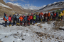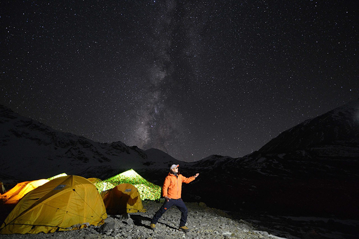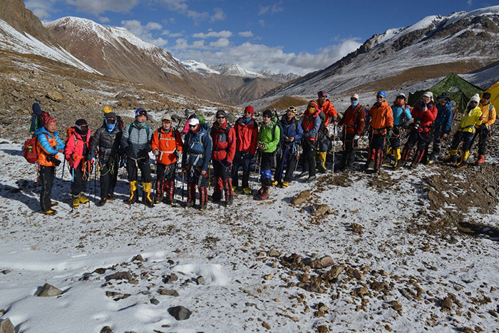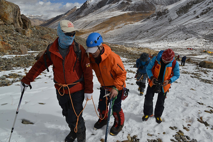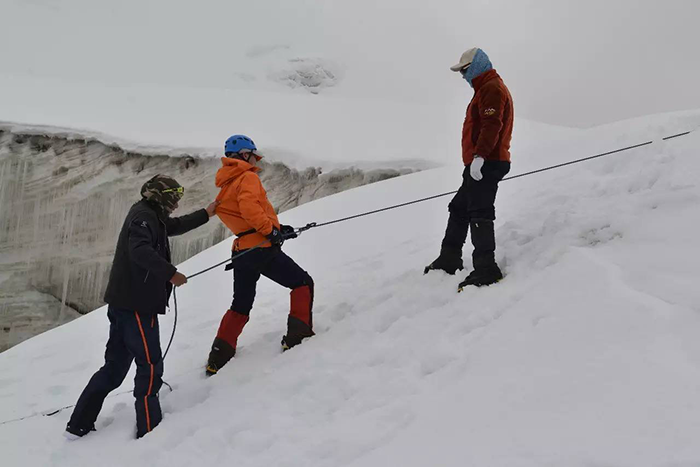 在海拔5500米處的雪線位置,教練們,選擇了一處較為平緩的雪坡,作為大本營,在這里對隊員們進行登頂前的指導訓練。指導隊員們使用上升器與下降器,體驗穿著高山靴帶著冰爪走路的感覺,教練們在這里認真介紹技術(shù)要領(lǐng),并耐心解答隊員們提出的各種問題。休息之余大家都躲在帳篷里,有說有笑,完全消除了屋外雪山的寒冷。有從內(nèi)地來的隊友,因高原反應,頭疼難忍,張洪就幫他們一一按摩推拿,緩解疼痛,大家就像一家人,其樂融融。