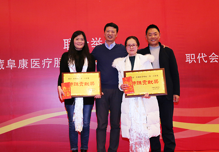 王斌董事長(zhǎng)、劉瀟瀟總經(jīng)理等院領(lǐng)導(dǎo)為先進(jìn)科室、優(yōu)秀員工頒發(fā)獎(jiǎng)?wù)录蔼?jiǎng)金