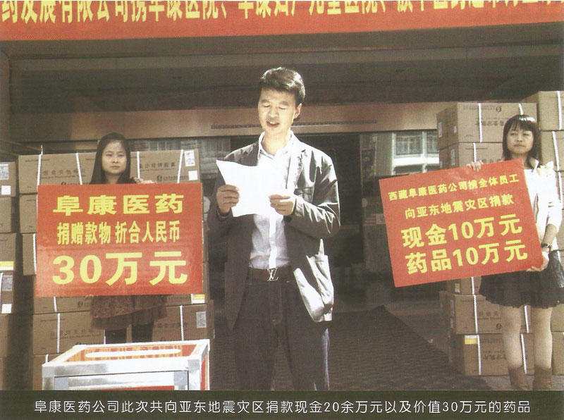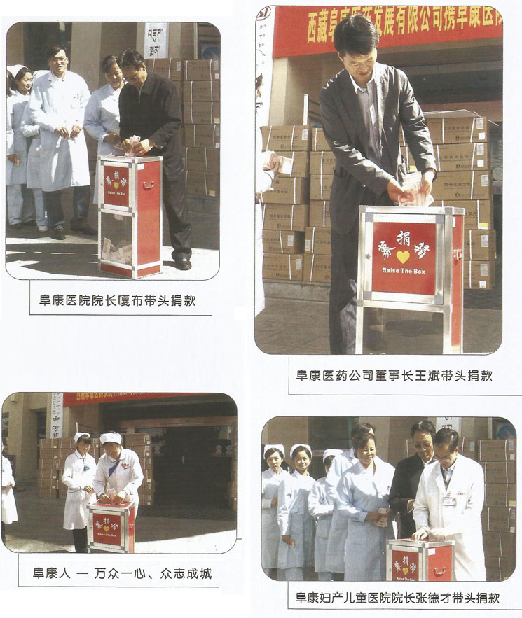 2011年9月8日,印度錫金發(fā)生了6.8級(jí)地震,地震造成了亞東縣供水、供電、交通、通信等度全部癱瘓。災(zāi)情牽動(dòng)所有西藏人民的心,更牽動(dòng)著阜康人的心。25日,為了支援災(zāi)區(qū),阜康醫(yī)藥發(fā)展有限公司攜阜康醫(yī)院、阜康婦產(chǎn)兒童醫(yī)院以及旗下醫(yī)藥超市舉行了為亞東地震災(zāi)區(qū)捐款儀式。在捐款現(xiàn)場,一箱箱捐助藥品整齊地堆放在起,捐歉員工排著整齊的隊(duì)伍有序的走到捐款箱邊,把自己的捐款投入到箱中。