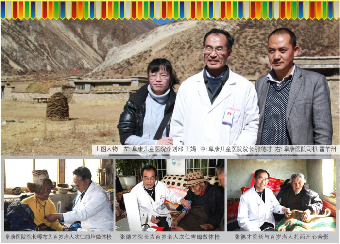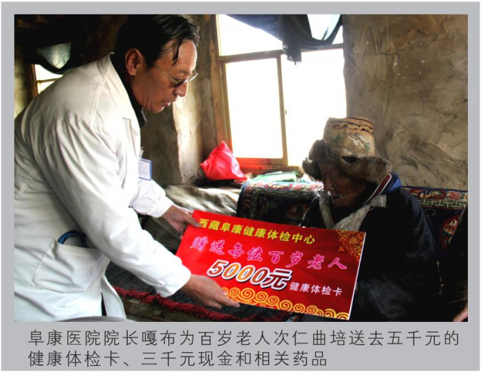 西藏高寒缺氧,自然環(huán)境惡劣。60多年前,這里的人均壽命才35.5歲。然而到了2012年,光拉薩的七縣一區(qū)就有16位百歲老人,正是這些百歲老人,見證了西藏翻天覆地的巨變,他們是全社會的寶貴財(cái)富,更是西藏從貧窮落后走向繁榮富強(qiáng)的親歷者、見證者。在全國人民喜迎黨的十八大勝利召開之際,西藏阜康(國際)健康體檢中心與拉薩市民政局老齡辦組織發(fā)起了“關(guān)愛百歲老人行動”。此次行動歷時(shí)16天,里程2000多公里,尋訪了拉薩七縣一區(qū)十一位百歲老人,不僅為每位老人送上了精心準(zhǔn)備的三千元現(xiàn)金、五千元健康體檢卡、一個(gè)便攜式氧氣瓶、一個(gè)便攜式血壓儀,還為他們送上了免費(fèi)義診和相關(guān)藥品。王斌董事長參加了此項(xiàng)活動的啟動儀式,嘎布院長、張德才院長親自帶隊(duì)為每一位百歲老人做了常規(guī)的身體檢查,并送上了藥品和祝福。