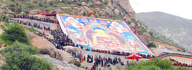 2013年的雪頓節(jié)于8月6日至8月12日在拉薩舉行。每年雪頓節(jié),晢蚌寺后山的展佛儀式都是一場重頭戲。盛大的展佛結(jié)束以后,才是羅布林卡的藏戲、歌舞表演,然后每家每戶吃酸奶。位于晢蚌寺后山腰上的巨幅釋迦牟尼唐卡畫像至今已有500多年歷史,高40米、寬34米。這幅由金粉、銀粉和珊瑚粉等繪成的巨型唐卡,平日深藏于寺院內(nèi),只有在雪頓節(jié)期間才在半山腰上以“曬佛”的行式展示在人們面前。這一藏傳佛教的盛事吸引了來自五湘四海的信眾和中外游客前來朝覲和觀瞻。在這一片歡樂、祥和、幸福的節(jié)日氣氛中,2009那次親歷哲蚌寺一睹展佛的壯觀場景又浮現(xiàn)在了我的眼前....