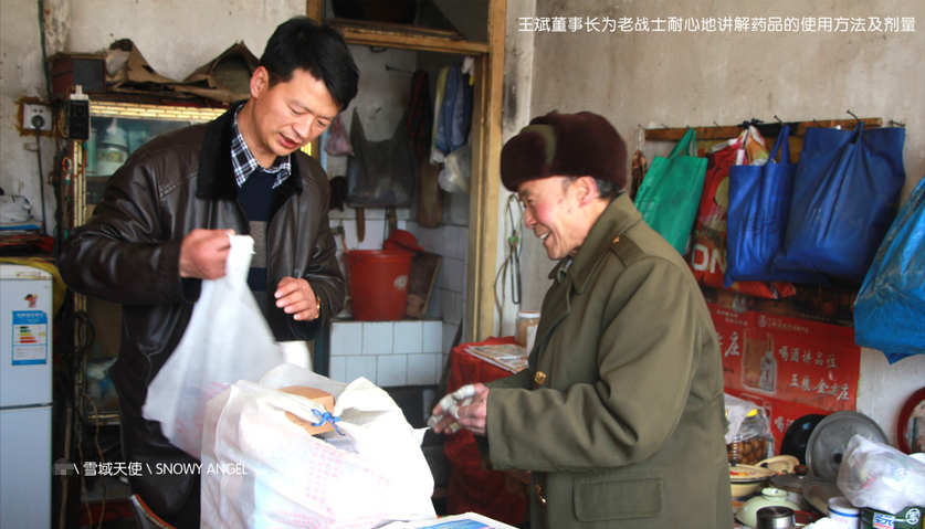 老同志開了一個(gè)小小的雜貨鋪,主要經(jīng)營(yíng)一些食用油、罐頭之類食品。原本不大的店面加之已是很陳1舊的招牌,使得這間雜貨鋪更為不顯眼。羅老同志見王斌先生來(lái)看望他,很是高興,就像是見到親人一般的激動(dòng)。王斌先生對(duì)老同志噓寒問(wèn)暖,親切地詢問(wèn)著他的病情,耐心地為他一一講解著這些藥品的使用方法及劑量,一遍一遍地叮囑著要他堅(jiān)持把有軟化血管作用的補(bǔ)品吃上。當(dāng)王斌先生準(zhǔn)備起身離開時(shí),老人家再次緊緊握住了他的手,感激地說(shuō)道:“ 謝謝你們還記得我,我打心眼里感謝你們!”