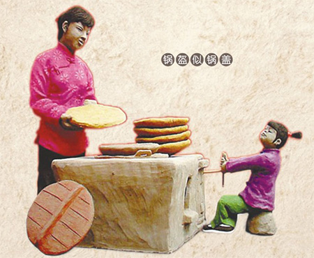 鍋盔在陜西可是隨處可見(jiàn)。它可是面食中的又一經(jīng)典。相傳唐代修乾陵時(shí),因服役的軍人工匠人數(shù)過(guò)多,往往為吃飯而耽誤施工進(jìn)度,受到懲罰。于是,有一士兵在焦急之中便把面團(tuán)放進(jìn)頭盔里,把頭盔放到火中去烤而烙成餅,這便有了鍋盔一說(shuō)。