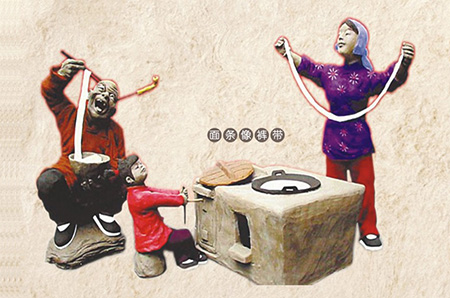 關(guān)中獨(dú)特的地理構(gòu)造和自然環(huán)境使得關(guān)中地區(qū)成為一個(gè)以面食為主的地區(qū),在以米菜為主的地方的人們總是想不通,那陜西人天天吃面條沒(méi)個(gè)花樣換,怎么就吃不煩呢? 其實(shí),在陜西,聰明靈巧的陜西婆娘們已經(jīng)把面食發(fā)展到一個(gè)很高的境界了。單是一個(gè)簡(jiǎn)單的面條,關(guān)中人做出的花樣達(dá)幾十種,棍棍面、片片面、涼面、臊子面、酸湯面、漿水面等等。