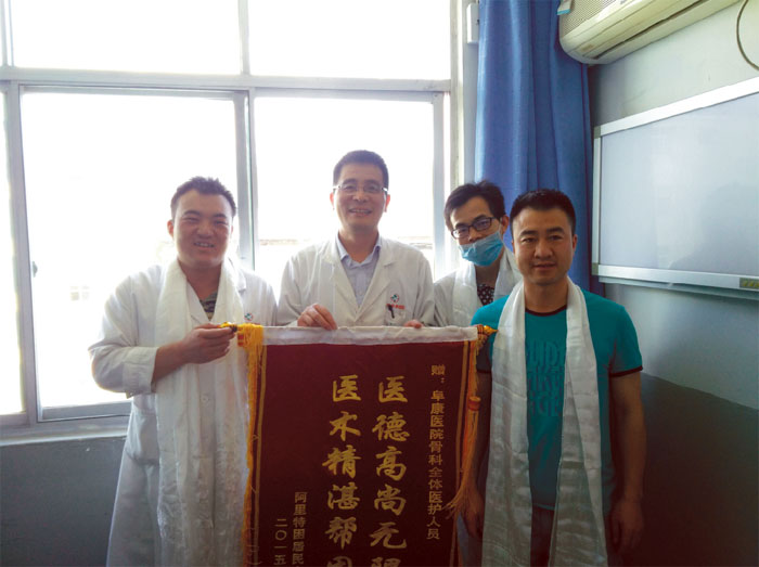 2015年5月23日,外一科收治一名來自曲樂鄉(xiāng)尼雄二村名叫扎西(化名)的病人,診斷為右脛骨開放性粉碎性骨折并大面積皮膚壞死,住院63天,共四次手術(shù)。因經(jīng)濟困難,無法承擔(dān)所欠的四萬兩千余元。向上級領(lǐng)導(dǎo)匯報后,王斌董事長指示:先治病,所欠費用由雪域天使基金會補充。出院當(dāng)天,患者及家屬為我院骨科醫(yī)生獻上哈達和錦旗以表感謝之情。