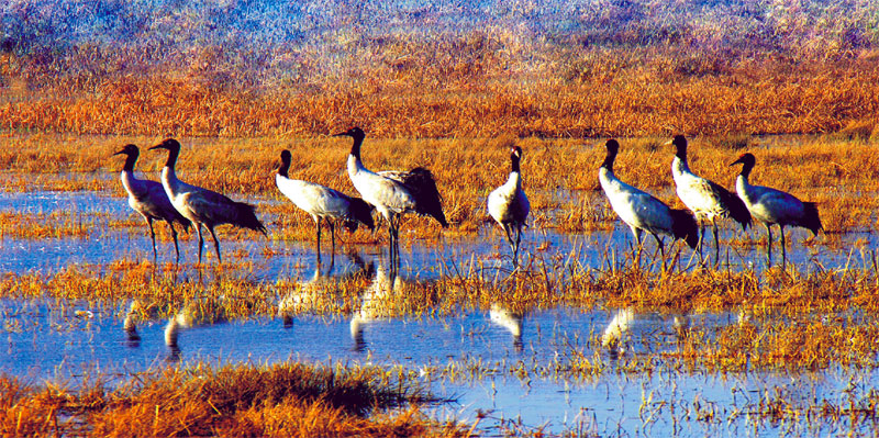 好不容易見到三只,小彭一邊扭著身子一邊低聲自語(yǔ):“黑頸鶴呀黑頸鶴,你轉(zhuǎn)過身子抬起頭來(lái)看看我。又不是孔雀,干嗎總把屁屁朝這邊。”黑頸鶴不懂人語(yǔ),也懶得猜人的心思。有一點(diǎn)可以保證,這里雖然車來(lái)人往,卻是安全的。