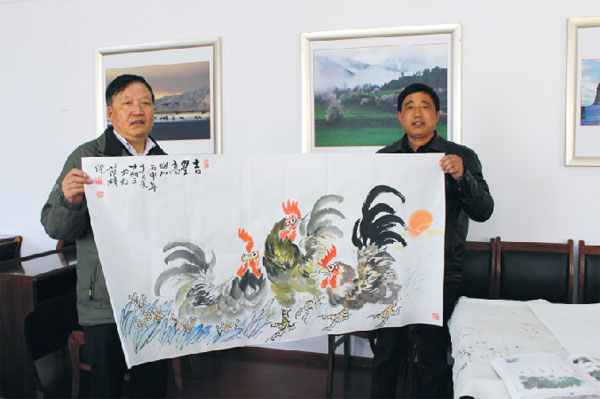 3月28日受自治區(qū)文聯(lián)黨組書記兼副主席沈開運(yùn)邀請陳明文先生在自治區(qū)文聯(lián)會議室作文化交流。交流會上陳明文先生展示了自己的近期作品,沈開運(yùn)主席代表自治區(qū)文聯(lián)收錄了其畫作《吉星高照》。