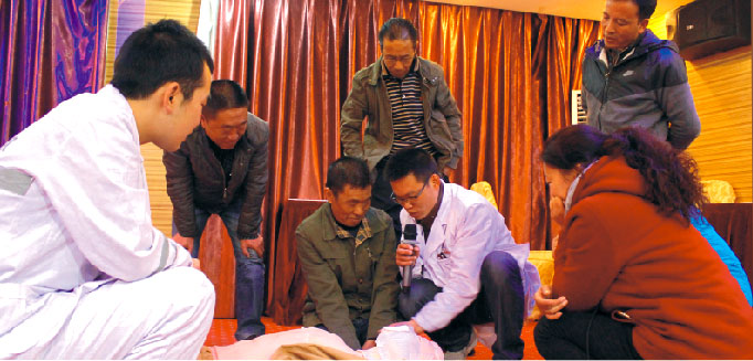 2016年3月24日,我院受邀于國網(wǎng)西藏直孔發(fā)電公司開展緊急救護培訓,由內(nèi)科醫(yī)生盤允、急診科護士肖明洋分別就“創(chuàng)傷院前急救技術”及“心肺復蘇概述”等相關專業(yè)知識進行講解。