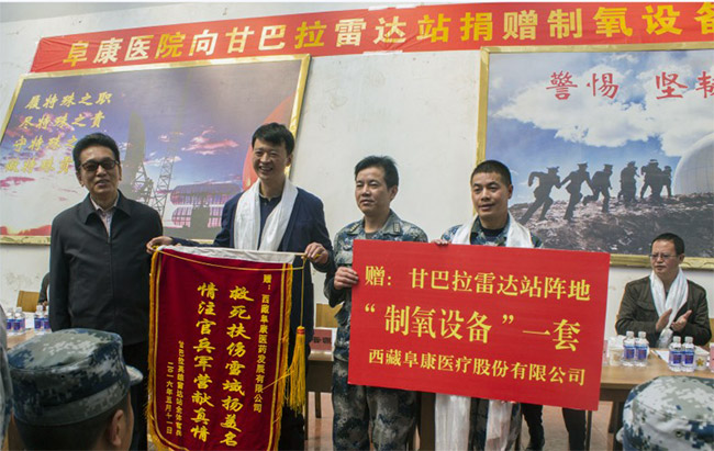 2016年5月11日,西藏阜康醫(yī)院有限公司向甘巴拉雷達(dá)站捐贈(zèng)制氧設(shè)備儀式在甘巴拉雷達(dá)站營地舉行,西藏自治區(qū)政協(xié)副主席、區(qū)工商聯(lián)主席、區(qū)總商會(huì)會(huì)長阿沛·晉源,區(qū)工商聯(lián)副主席劉洪,區(qū)工商聯(lián)政研室主任張?jiān)茖?,區(qū)工商聯(lián)經(jīng)聯(lián)處副處長秦林,95662部隊(duì)政治委員楊壽保,甘巴拉雷達(dá)站政治教導(dǎo)員李再華,西藏阜康醫(yī)療股份有限公司黨委書記、董事長王斌,黨委副書記、總院長張德才,黨委紀(jì)檢委員、總經(jīng)理陳彬以及甘巴拉雷達(dá)站全體官兵等出席了本次捐贈(zèng)儀式。